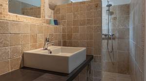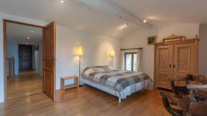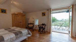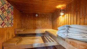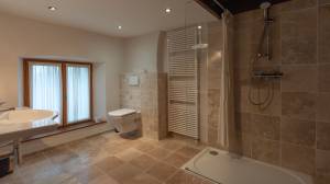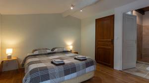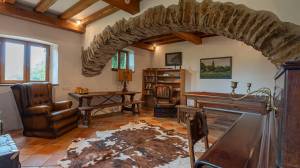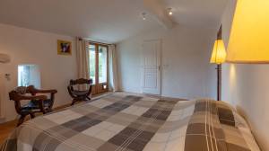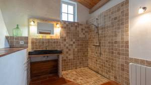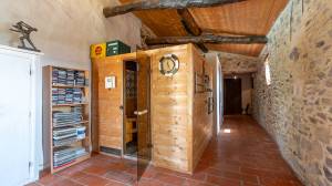 The stately main house has a spacious entrance hall, a cosy living room and a kitchen-diner. The living room has a built-in wood-burning fireplace. The kitchen has a large Godin stove with a five-burner gas hob, two electric ovens and a wood-burning oven/stove. On the ground floor, there is a bedroom with its own bathroom and walk-in closet/dressing room. On the first floor, you will find a mezzanine with hobby or office space and access to a second bedroom with bathroom. The second floor has two bedrooms, a bathroom and is further furnished as a luxurious relaxation floor with sauna, hammam and a spacious relaxation room with direct access to the swimming pool.