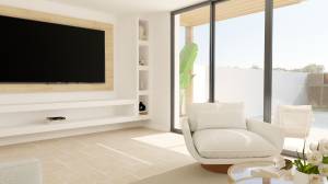 The kitchen compries a dishwasher, a combi-oven, and an electric stove for effortless cooking. The kitchen flows seamlessly into the dining area and the living room. The space is open and bright. The spacious living area, is designed for relaxation and entertaining. Large sliding doors provide an open view of the beautifully landscaped garden, flooding the space with natural light and creating a seamless indooroutdoor connection.