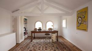 Tweede verdieping (vanuit de woonkamer) met grote kantoorruimte, gedeeltelijk verdeeld in twee kamers (22 m² en 21 m², beide met toegang tot het balkon op de tweede verdieping en de andere kant van het huis).