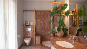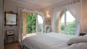 Eerste verdieping (bereikbaar vanuit de woonkamer) met slaapkamer (15 m²) met twee deuren naar een overdekt balkon, kleedkamer (6 m²) met deur naar het overdekte balkon, overloop (4 m²), badkamer (8 m²) met o.a. douche, wastafel en toilet, en deur naar het overdekte en afgesloten balkon, en toegang tot de andere kant van het huis.
