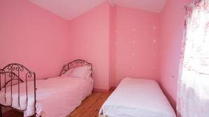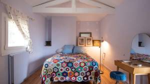Tweede verdieping (vanuit de hal) met slaapkamer (14 m²) met houten vloer en balken en de tweede slaapkamer (11 m²) met houten vloer en balken.