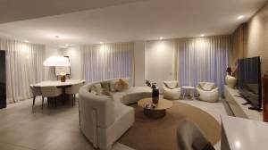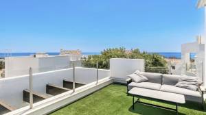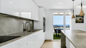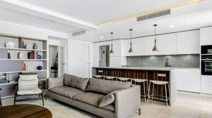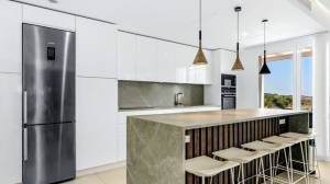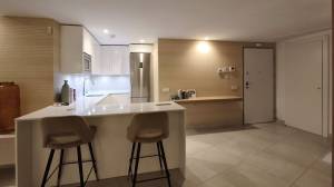 On the first level, we find an open-plan living area, bright and spacious, with raised ceilings that give this particular apartment a feeling of openness as you walk in. This penthouse has beautiful Porcelanosa flooring throughout, and a well-equipped kitchen that features a gorgeous newly reformed countertop island, perfect for entertaining or enjoying a relaxing brunch. All ceiling lights throughout the house are energy-efficient and feature invisible elements.