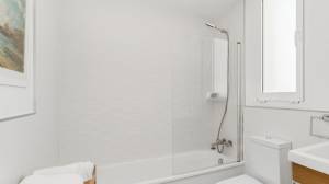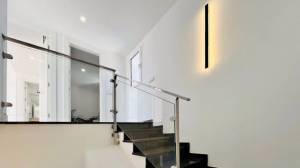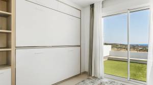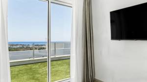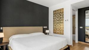 A sophisticated modern stairway leads us upstairs, where we find the master bedroom with its stunning en-suite bathroom, a luxe and inviting space with tons of natural light. There is also an equally bright second guest bedroom and an additional bathroom. All rooms come with ample built-in closets. On that same level, we find a second terrace, perfect for sunbathing, since it is perfectly private, and where one can enjoy a snack while enjoying the wonderful views.