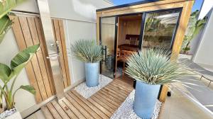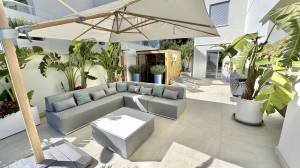 Enormous 110 m2 private terrace with luxury sauna room and outside shower, plus garden storage room. Partly covered / partly open, giving the best of both worlds, shade from the sun and sunbathing areas, offering the perfect entertaining or private relaxation area.