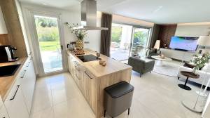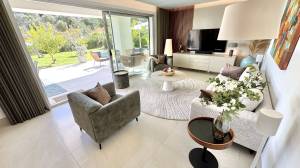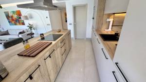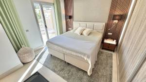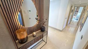 This modern corner garden apartment for sale offers near idilic modern luxury living and gives the feeling of living in a new build one level villa. High quality build with modern open plan layout and beautifully decorated throughout. Entrance hall with luxury wallpaper and wood panelling in parts, leading onto main living area and all bedrooms and bathrooms.